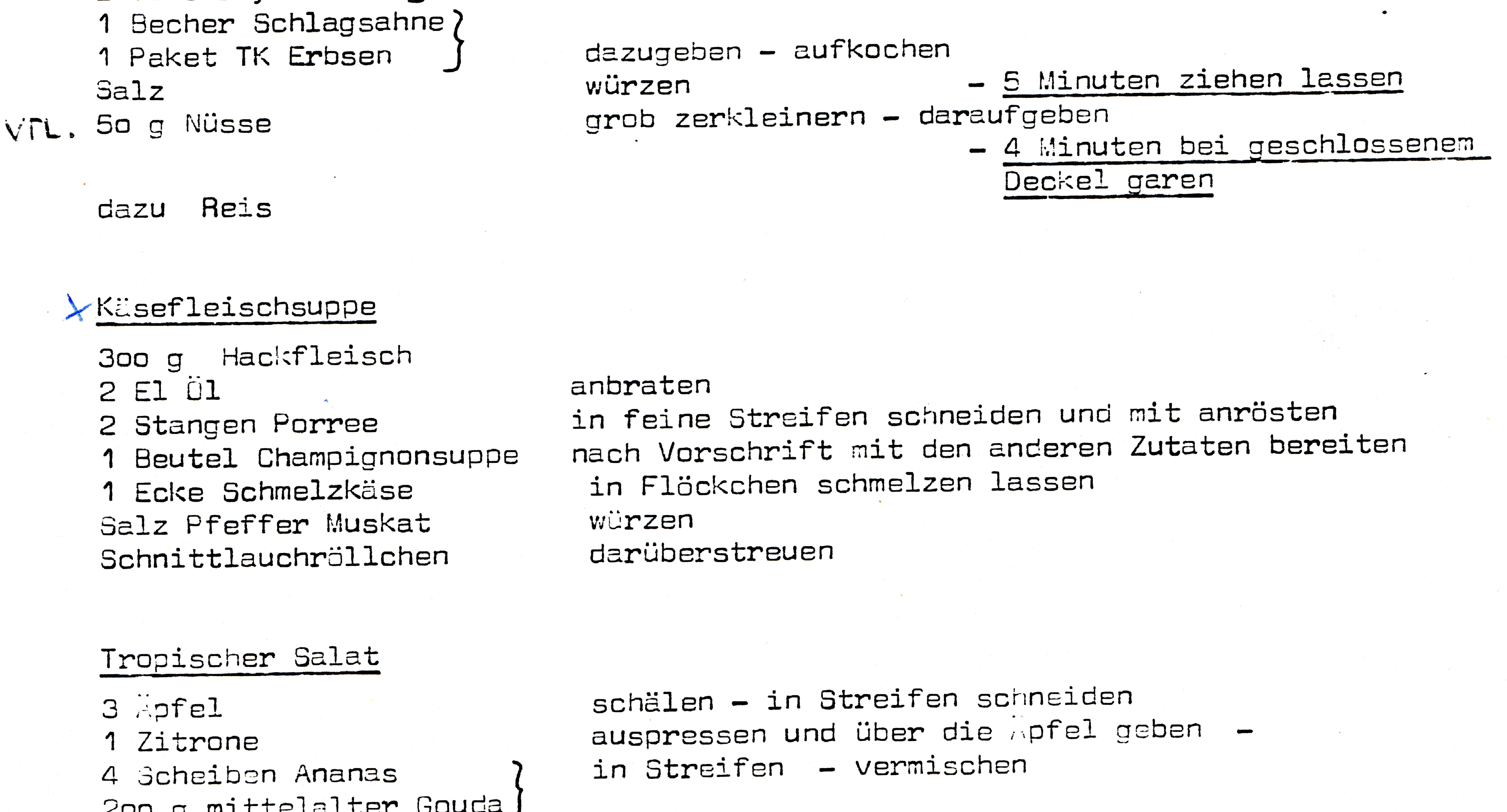 - Aus meinen ersten Kochkurs 1981 - so glaube ich - hat ein Rezept die ganze Familie erobert: die "Käsefleischsuppe". Mittlweile koche ich Sie nicht mehr wie damals: mit Milch statt Schmelzkäse; damit ist sie auch wohl etwas kalorienärmer, aber ein Genuß für kalte Tage.